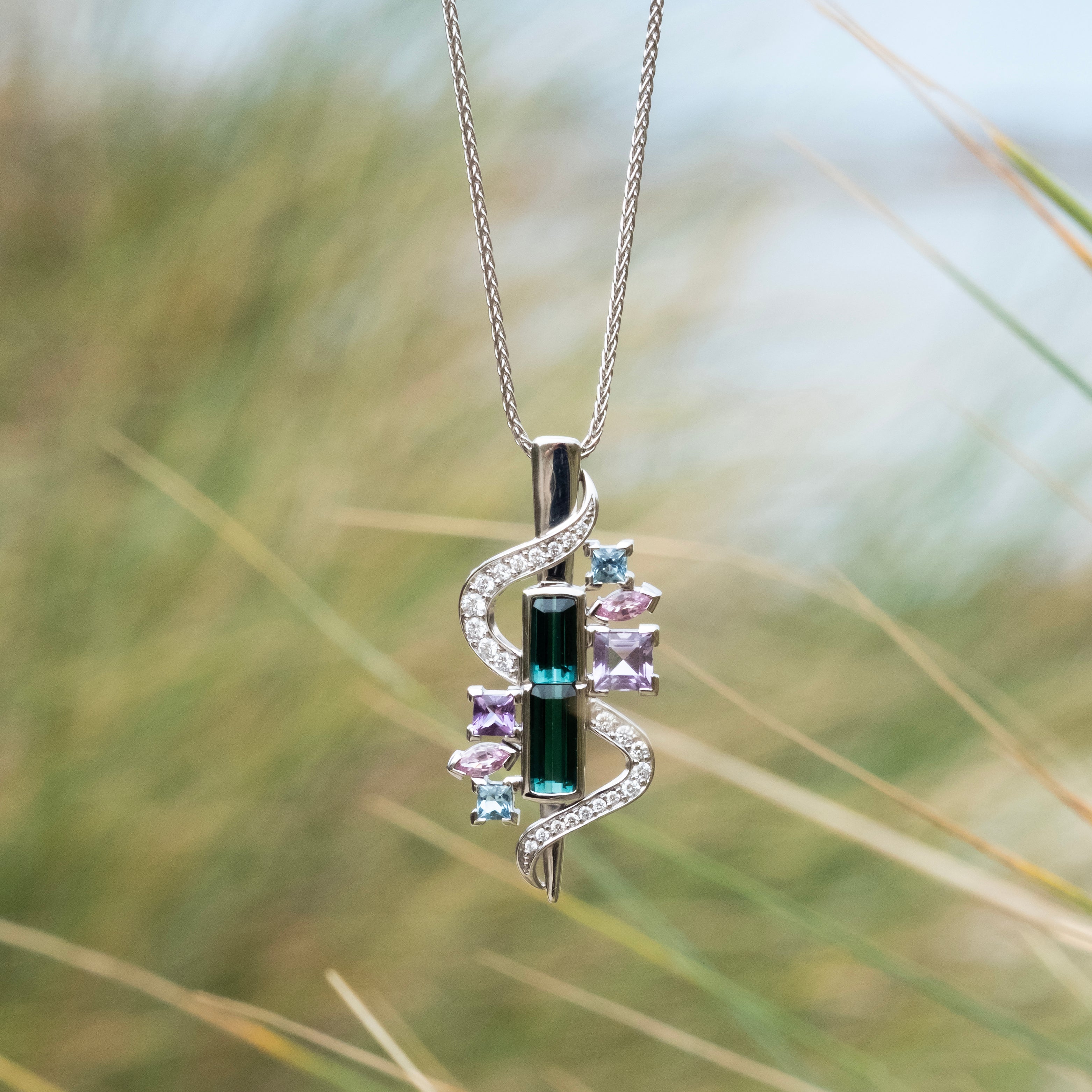 Every gemstone pendant tells its own story of colour, light, and artistry. With striking Tourmalines and Diamonds, this design captures the light in motion, creating a piece that is beautifully unique.