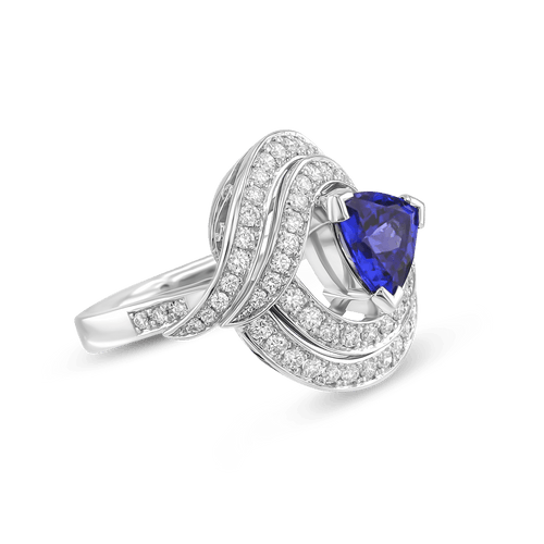 At its heart is a trillian cut Tanzanite of incredible colour and clarity. Entirely handmade in platinum Amour is set with ove. More