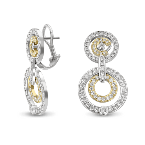 One of Catherine's favourites designs Diamond Daze is a shining example of all things Catherine Best.The adornment of shining brilliant cut diamonds weighing over three carats is highlighted beautifully in this mix of 18ct yellow and white gold. The two tone look makes the design perfect for wearing various attire and as a fine detail the earrings are fitting with omega fittings which include a traditional earring post with a wonderfully comfortable fitting.
