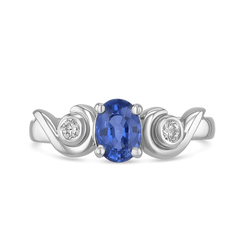The 7mm by 5mm centre oval Gemstone is a wonderful size and can lose the viewer within its depths, creating impact when juxtaposed against the clarity and light of the diamonds that flank it, hugged in the curves of the design.
