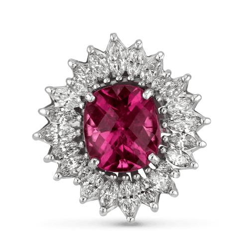 Explore your undying love and passion for one another with this incredibly special piece of jewellery. Nestled in its heart is a gorgeous pink rubellite tourmaline of stunning colour surrounded by just under three carats of diamonds and al. More